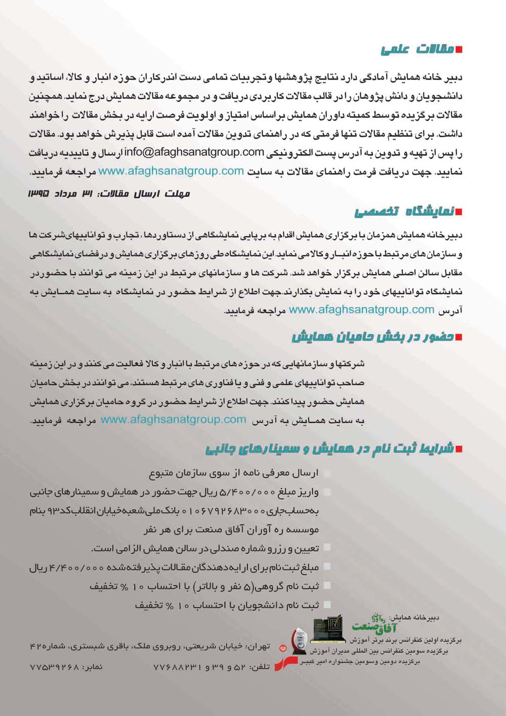 دبیر خانه همایش آمادگی دارد نتایج پژوهشها وتجربیات تمامی دست اندرکاران حوزه انبار و کالا، اساتید و دانشجویان و دانش پژوهان را در قالب مقالات کاربردی دریافت و در مجموعه مقالات همایش درج نماید. همچنین مقالات برگزیده توسط کمیته داوران همایش براساس امتیاز و اولویت فرصت ارایه در بخش مقالات راخواهند داشت. برای تنظیم مقالات تنها فرمتی که در راهنمای تدوین مقالات آمده است قابل پذیرش خواهد بود. مقالات راپس ازتهیه و تدوین به آدرس پست الکترونیکی info@afaghsanatgroup.com ارسال و تاییدیه دریافت نمایید. جهت دریافت فرمت راهنمای مقالات به سایت www.afaghsanatgroup.com مراجعه فرمایید.