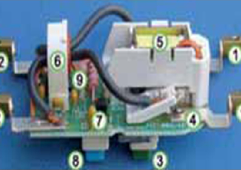 سیم برق ورودی (فاز) و هادی خنثی (نول) به ترمینالهای (۱) و سیمهای خروجی به ترمینالهای (۲) وصل میشوند. سیم اتصال زمین، از طریق خط تغذیه به بار، بدون قطعی وصل میشود. موقعی که دکمه ریست (۳) فشرده میشود، کنتاکتهای (۴) و (۵) پشت آنان وصل میشوند و اجازه به عبور جریان را میدهند. سیمپیچ (۵) کنتاکتها را موقعی که ریستها شود، بسته نگه میدارد. سیمپیچ حساس (یک ترانسفورماتور جریان اختلافی) است که هادیهای جریان و خنثی (فازونول) را احاطه کرده است.